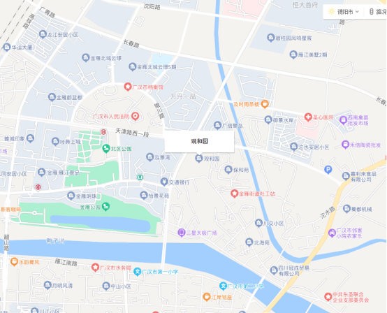 資產位于廣漢市區北京路與天津路交匯處,為新區中心,商住環境較佳,附近有多個住宅樓盤,政府機構、金融機構較集中。資產1號樓、6號樓的商業房產,均位于一層,層高6.5米。樓上均為商業住宅式公寓。地理位置如下: