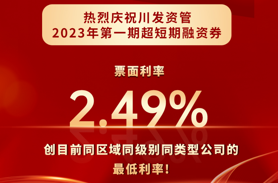 2023年7月24日,四川發展資產管理有限公司2023年第一期超短期融資券在北金所成功發行,發行規模3億元,期限180天,由興業銀行承銷。本期債券發行獲大量投資者關注,全場認購倍數達2倍,最終取得2.49%的票面利率,為目前同區域同級別同類型公司的最低利率。